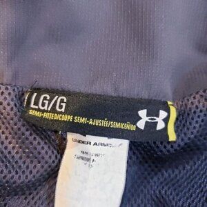 UA Under Armour Gray Semi Fitted Lightweight Mesh Lined Zip Up Windbreaker Athletic Track Warm Up Jacket. Ruching detail at neck. Front pockets. Good pre-owned condition.