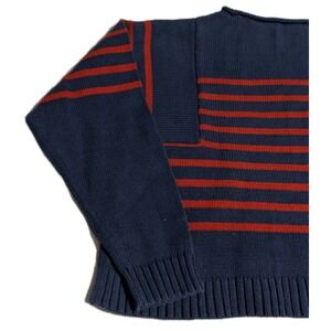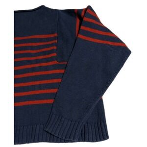 Classic Madewell knit pullover featuring a relaxed boxy fit with a cropped length. Navy blue cotton knit with red Breton-style stripes across the chest and sleeves.