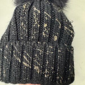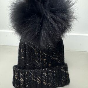 Stylish black knit beanie featuring a faux fur pom. Perfect for cold weather.