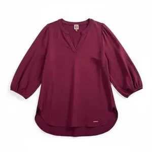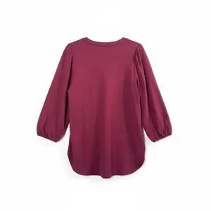 Elegant Anne Klein blouse in a rich burgundy/wine color. Features a flattering split V-neckline, softly puffed 3/4 sleeves with elastic cuffs, and a curved high-low hem. Lightweight and polished—perfect for workwear, business casual, or dressed up with trousers or a skirt.