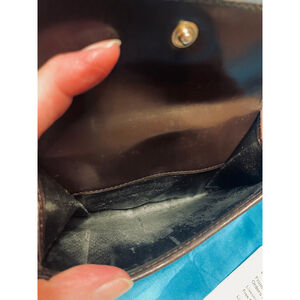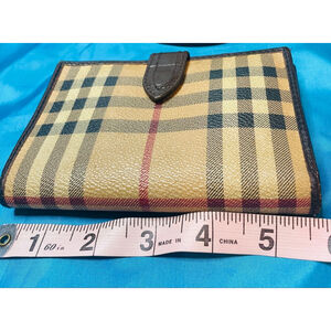 This pre-owned Burberry wallet features the brand's signature Haymarket check pattern on the exterior with brown leather trim and a snap closure. The interior is lined with brown leather and includes multiple card slots and compartments. The wallet is made in Italy and branded with the Burberry Equestrian Knight logo. Visible signs of wear include minor scuffing on the leather trim and some lining peeling residue inside the coin compartments. A measuring tape indicates the wallet is approximately 4.5 inches wide when closed. Very nice wallet.