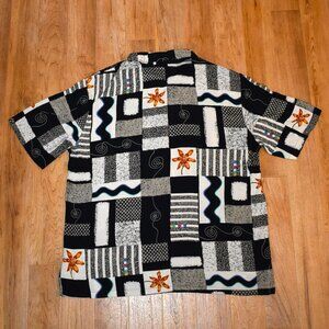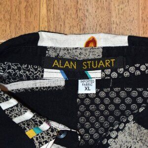 Short sleeve button up shirt by Alan Stuart. Size XL and 100% viscose. Fun pattern in mostly black/white, with splashes of color. In excellent condition with no holes, tears, or stains. Comes from a smoke free home.