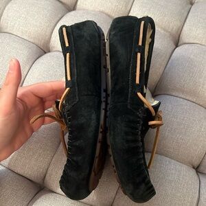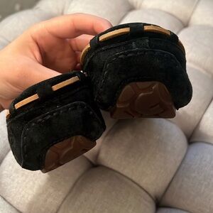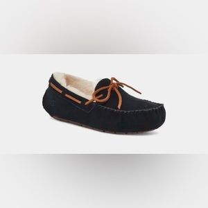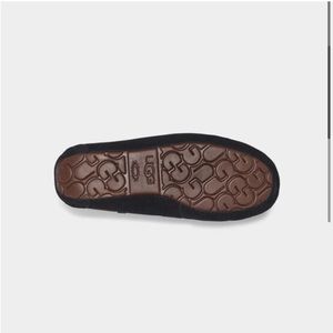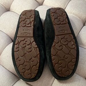UGG. EUC. Some minor signs of wear to suede due to use. Some wear to shearling interior near back heel. Black, brown, and cream. Fur lined. Indoor/outdoor sole. Suede bow. Suede moccasin slipper. Cozy. Classic. Authentic. Bundle multiple items for savings! Smoke free home.