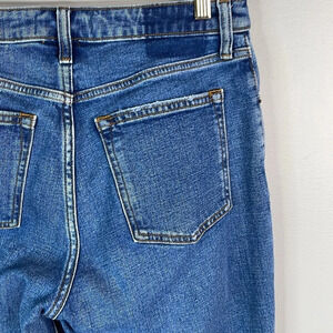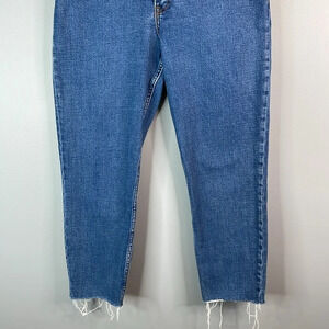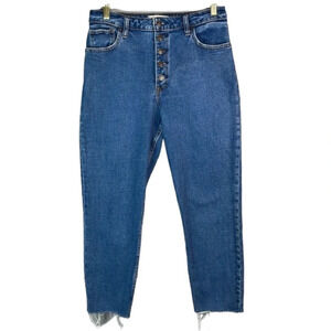 Women’s blue medium wash denim Abercrombie & Fitch “Curve Love” “The Mom” “High Rise” Jeans. Button Fly, 5 pocket design. Raw hem. Tapered straight leg.