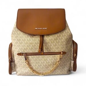 Stunning Michael Kors Bedford Legacy Medium Logo Backpack in the Vanilla/Acorn colorway. Crafted in MK’s signature coated canvas with rich acorn leather trim and gold-tone hardware. This bestselling style features a chic front chain detail, side zipper pockets, and a spacious interior — the perfect mix of luxury + function.
