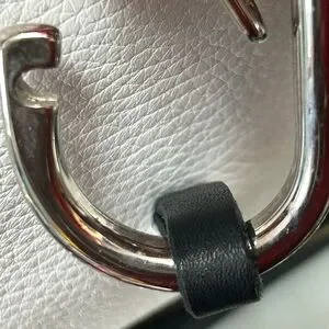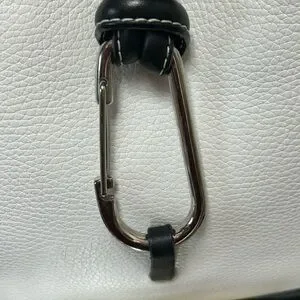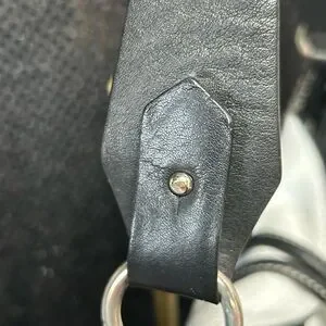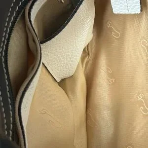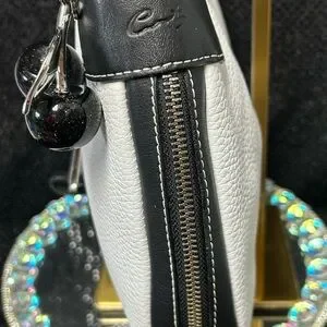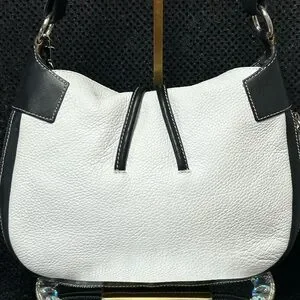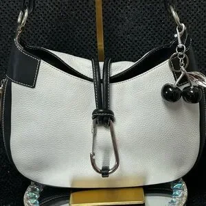Elevate your style with this chic black and white women's bag. Perfect for any occasion, this bag combines elegance with functionality. The interior is beige sateen cloth w/monogram. It has a zipper pocket and a small slip pocket. This bag has never been used. No spots on the white leather. All hardware is silver-tone.