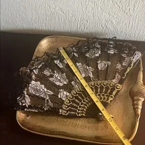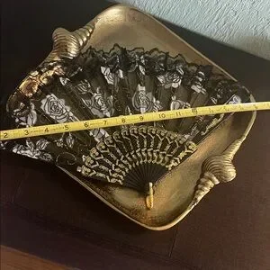 Add a touch of sophistication to your home with this elegant black and gold lace fan. Perfect for enhancing any room's decor.
