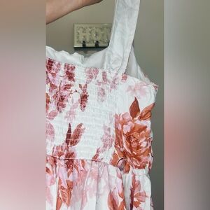 Chic mini dress with pink floral pattern. Features button accents and sleeveless design. Perfect for warm days.