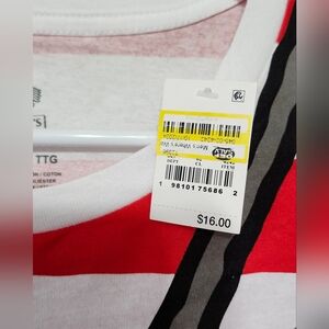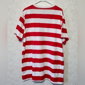 Fun red and white striped t-shirt featuring a playful design. Comes with a matching beanie.