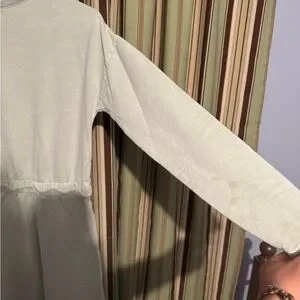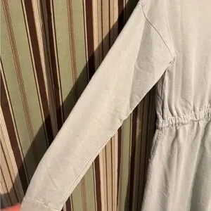 This casual dress features a soft gray fabric with a crew neck and long cuffed sleeves, perfect for relaxed outings. The gathered waistline adds a touch of shape to its simple silhouette, making it both comfortable and stylish.