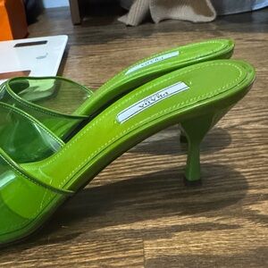 Elegant green mules with a sleek design. Features Prada logo detail. Perfect for stylish outings.