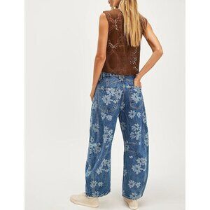 Women's Baggy Wide Leg Denim Jeans Floral Print Mid Rise Ankle Pants