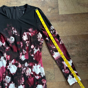 This is a pre-owned White House Black Market dress, size 6. It features a black bodice and long sleeves, transitioning into a floral pattern of white and burgundy hues. The dress has a knee-length cut and a concealed back zipper. The material appears to be a blend of synthetic fibers. There are no visible tears or stains. The dress measures approximately 39 inches in length and 18 inches across the chest.