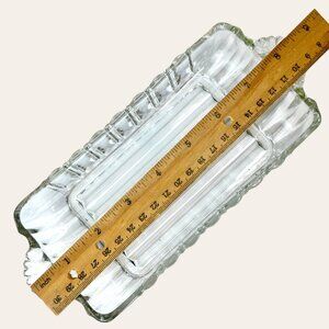 This elegant Anchor Hocking Glass A560 relish dish features vanity fan handles and scalloped edges, perfect for serving appetizers or as a decorative piece. Made in the USA, it adds a touch of vintage charm to your table setting.