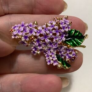 Lavender purple lilac brooch. Enamel lilac flowers gold tone. Notice the small rhinestone accent pieces. This brooch is a true beauty.