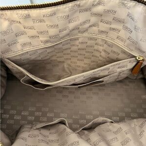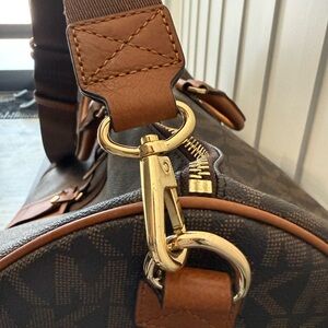 Stylish travel bag with iconic MK pattern. Features durable handles and adjustable strap. Perfect for trips.