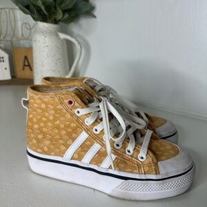 Step into the magic of Disney with these limited-edition Adidas x Disney Bambi sneakers! Featuring an adorable mustard yellow polka-dot upper, pink eyelets, and soft white Adidas stripes, these platform high tops showcase subtle design nods to the beloved Bambi character. A sweet collectible for any Disney fan or streetwear lover.