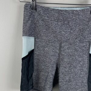 Stylish gray athletic shorts with black and light blue accents. Perfect for workouts.