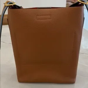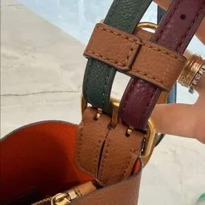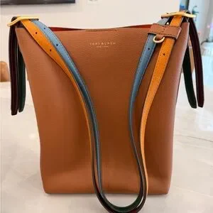 Authentic Tory Burch tote crafted in soft pebbled leather in a rich camel brown. Features beautiful multicolor leather shoulder straps (blue, tan, burgundy & green tones) with gold-tone hardware and subtle logo stamp. Chic, minimal, and perfect for everyday wear.