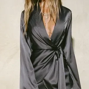 Versatile blazer with a wrap silhouette. Features an adjustable tie waist and shawl collar neckline.