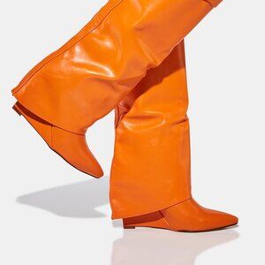 The AZALEA WANG" TOTALLY CUFFED " Wedge Boot in Orange features vegan leather upper, below the knee shaft, belated detailing with metallic AW logo accent, and a covered wedge heel. Complete with a pointed toe and slip on fit.