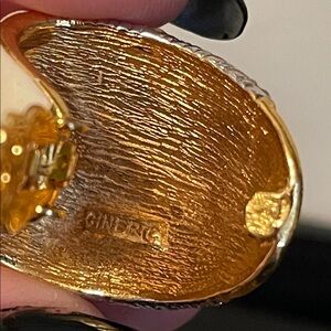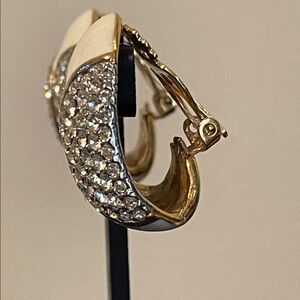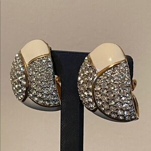 Glamorous vintage Ciner clip-on earrings featuring white enamel, Swarovski crystals, and 18K gold-plated finish. The brand's vintage pieces, like these pictured, blend timeless elegance with a touch of Old Hollywood glamour and remain highly sought-after by collectors. In excellent vintage condition, secure clips, and measure 1 1/2” x 1”.