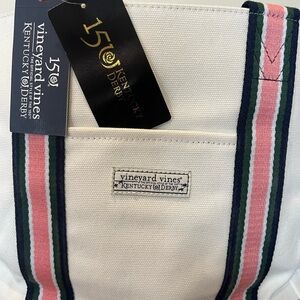 Get ready for the Kentucky Derby with this new Vineyard Vines 150 year Churchill Downs Classic Heritage Tote. White with nautical navy base, the striped straps are pink, white green and navy. Measures 13w x 11.5L. Side is 7”, base 7” strap drop is also 7”. Navy interior with a zip pocket and two open pockets. Excellent condition.