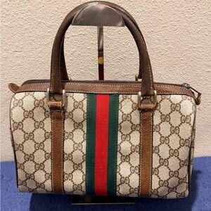 Authentic Gucci Boston Bag GG Supreme Monogram Canvas with Signature Sherry Line Web Stripe