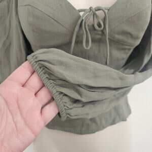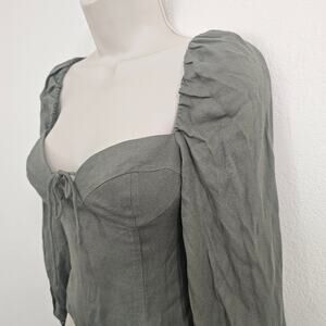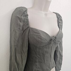 Sage green long-sleeve bustier top with a sweetheart neckline, smocked back panel, princess seams, a hidden internal zipper, and puff sleeves. Size XS; new with tags.