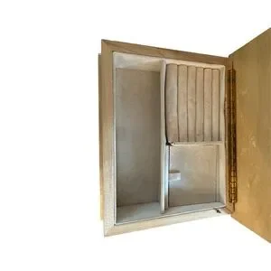 Interior: Lined with plush, cream-colored velvet. Includes a dedicated ring organizational section and a spacious compartment for necklaces, bracelets, or trinkets.