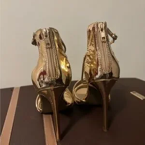 Turn heads in these stunning Zigi Soho metallic rose gold heels! Features a sleek strappy design, high stiletto heel, and back zipper closure for easy on and off. The reflective rose gold finish adds a touch of glam to any outfit — perfect for weddings, parties, or date nights.