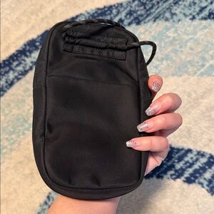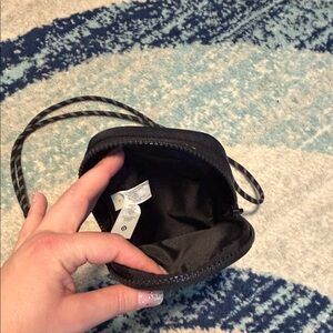 Sleek black crossbody bag. Features adjustable strap. Perfect for on-the-go. Fits iPhone, credit cards and lip gloss.
