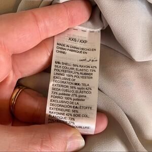 WHBM white floral burnout sheer top. Sheer material with velvety floral design. Body is fully lined and arms are sheer. Elastic neckline - can also be worn off shoulder. Elastic tie sleeve cuffs. Curved hemline. Size XXS. NWT. Has one tiny snag as shown.