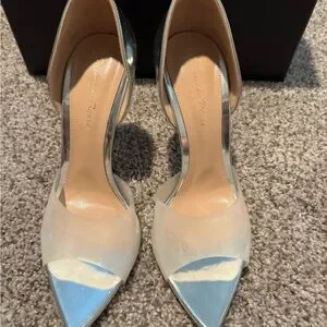 Chic Gianvito Rossi heels with a metallic silver and cream design. Perfect for adding elegance to any outfit.