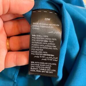 WHBM blue floral dress with split sleeves. V neck. Asymmetrical hemline. Slits in sleeves. Fully lined. Zips in back. Size 22W. NWOT. A couple of tiny snags / pulls as shown. 100% polyester. Machine wash.