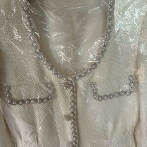 Chic ivory dress with long sleeves. Adorned with pearl accents on pockets and buttons. Ideal for elegant events.