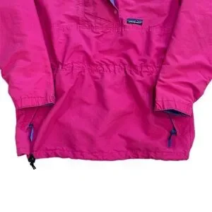 Rare late 1980s Patagonia Women's Mountain Anorak in a bold hot pink colorway with contrasting purple trim and storm flap. Classic pullover silhouette with snap-over zip placket and an adjustable drawcord waist that can be tightened from inside the pocket for a customizable fit. The hood features a structured brim for added shape and coverage.