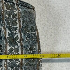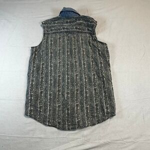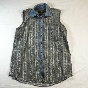 Vintage sleeveless button-down top from Hunt Club features a unique vertical floral stripe pattern with a contrasting denim collar and placket. Crafted from 100% cotton, this piece offers a classic fit with a single chest pocket and a curved hemline. The muted blue and grey tones provide a versatile aesthetic, while the metal buttons add a touch of rugged detail. Perfect for layering or wearing on its own, this top captures a timeless cottagecore or western-inspired look.
