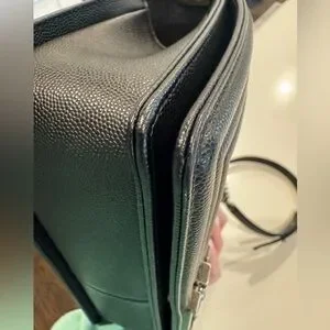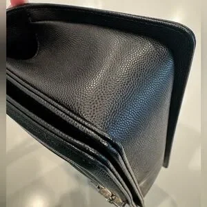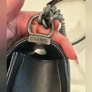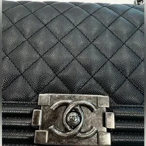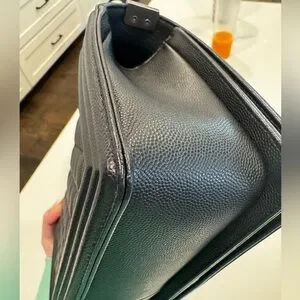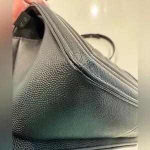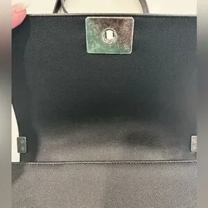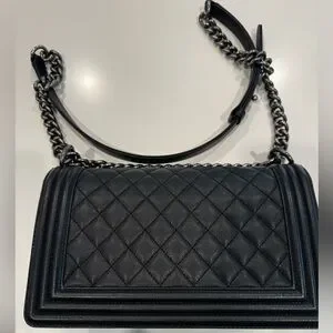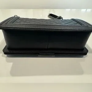 Excellent condition Chanel Boy Bag in the old medium size with ruthenium hardware. Black caviar leather. The exterior is an excellent condition with no wear to botr. Corners are not scuffed. The shape of the bag is still in tact. The interior does have some light scratches.