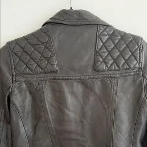 Sleek black leather with quilted shoulders. Asymmetrical zip closure. Perfect for edgy style.