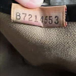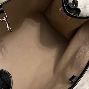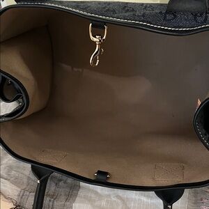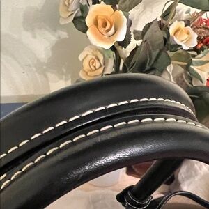 Super cute looks like a dark dark navy/black denim color with a black leather trim and white stitching.