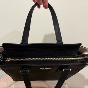 Stylish Kate Spade satchel with a sleek black front and tan sides. Ideal for everyday use.
