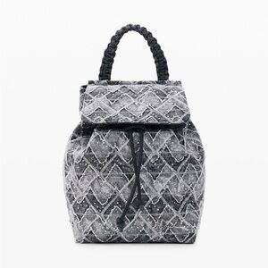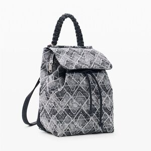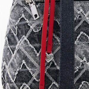 Small backpack made of denim fabric, with zigzag print and removable charm.