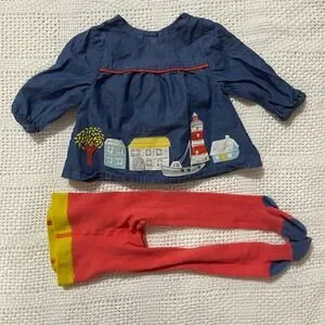 Baby Boden Denim Top Nautical Lighthouse Boat Applique Tights Set 0-3 Months