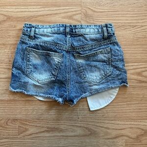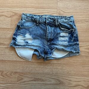 Stylish ripped jean shorts. Classic blue denim. Perfect for casual wear. High waisted.