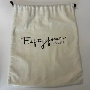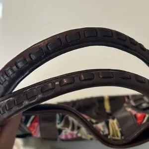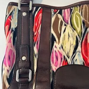 This Fossil Fifty Four shoulder bag features genuine brown leather paired with a distinctive woven tapestry panel in a multicolor abstract pattern. Cover included for storage when not in use to protect the bag.