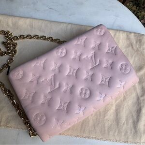The Pochette Coussin is crafted from soft lambskin, which is embossed with the Monogram pattern to create a puffy, cushiony effect. This is further enhanced by the construction of the pouch, which gives it a supple, body-friendly shape. The removable chain, decorated with a Louis Vuitton charm, offers different carry options: clutch, shoulder or belt bag bumbag.