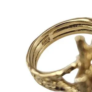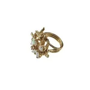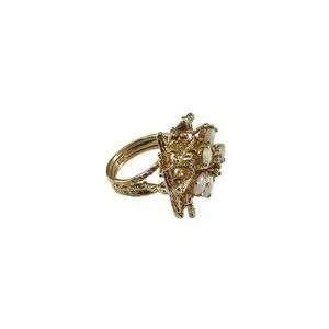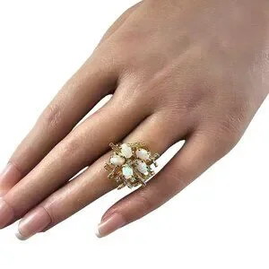 This stunning 18K yellow gold ring features five oval opal gemstones and five round single cut diamonds set in a sculptural branch-like setting. A true statement ring that captures the freeform artistry of the 1960s-70s.