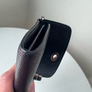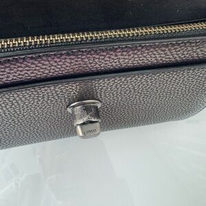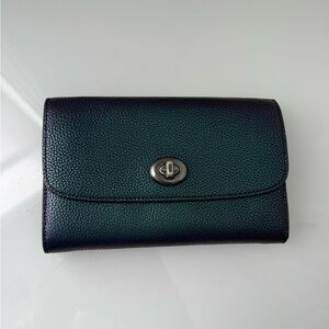 Statement Coach wallet featuring an iridescent oil-slick finish with green, purple, and multicolor tones. Black leather interior. Designed with convertible functionality for crossbody or wristlet use (straps not included). Sleek, bold, and eye-catching.