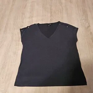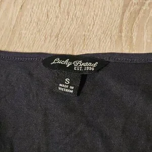 This Lucky Brand blouse is a size S in dark blue with a V-neckline and short sleeves. It features a relaxed fit with button accents and a pullover closure. The lightweight fabric makes it suitable for all seasons and occasions, including travel, casual outings, and workwear. This bohemian-style top has a basic design and is machine washable, ideal for everyday wear.
